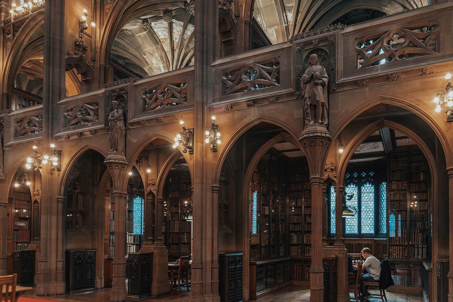 Another magical gem in Manchester is John Rylands Library. It's an extraordinary place of wonder that could motivate anyone to read. Even though the library might not be the first thing that comes to mind when you step inside the building. If it wasn't for the book-lined rooms, you might think you've stepped inside a castle or cathedral. Or a Harry Potter scene. The masterpiece of Victorian Gothic architecture is stunning.